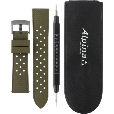Dit Alpina horlogebandje is gemaakt van rubber en wordt aan het horloge bevestigd door middel van bandpennen. De band heeft een breedte van 21 mm en wordt gesloten door middel van een gesp. De band heeft een rechte aanzet wat betekent dat deze band geschikt is voor alle Alpina horloges met een rechte aanzet.