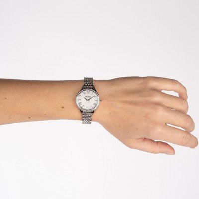 Dit mooie en elegante dameshorloge is bezet met 56 Top Wesselton W-SI diamanten, van in totaal van 0.221 karaat.