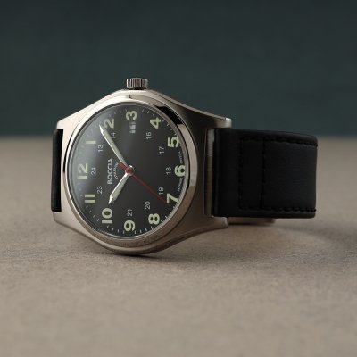 Dit Boccia horloge heeft een kast gemaakt van Titanium met een diameter van 39 mm en is voorzien van een leer band. In de kast bevindt zich een Miyota kwaliteitsuurwerk en is afgewerkt met Saffierglas.