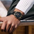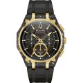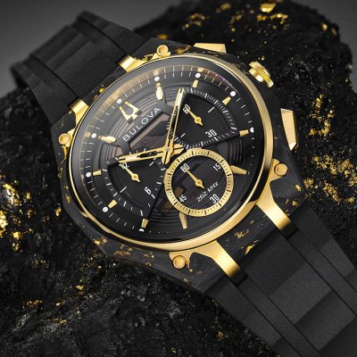 De Bulova Curv is een wonder van technische techniek met een slank ergonomisch ontwerp en een slanke kast die nooit eerder mogelijk was in een chronograaf horloge. Bulova buigt de regels met 's werelds firste gebogen chronograaf uurwerk. Alle Curv uurwerken worden aangedreven door een eigen hoge precisie quartz uurwerk met 262 kHz frequentie dat buitengewone nauwkeurigheid biedt. Maak kennis met onze Curv 2025. Nieuw design en nieuwe innovatieve materialen komen samen om deze opvallende kast te creëren. Gesmeed carbon wordt gecombineerd met goudfolie van 97,97% puur goud om ons Curv-uurwerk in onder te brengen. Het frame van de kast benadrukt het nieuwe ontwerp van de wijzerplaat en is afgewerkt met een premium HNBR rubberen band en vouwsluiting voor een comfortabele bevestiging om de pols.