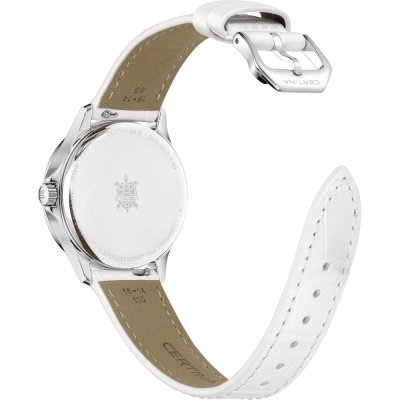 Dit Certina horloge heeft een kast gemaakt van Staal zilver met een diameter van 32 mm en is voorzien van een leer band. In de kast bevindt zich een ETA kwaliteitsuurwerk en is afgewerkt met Enkelvoudig ontspiegeld saffierglasglas.