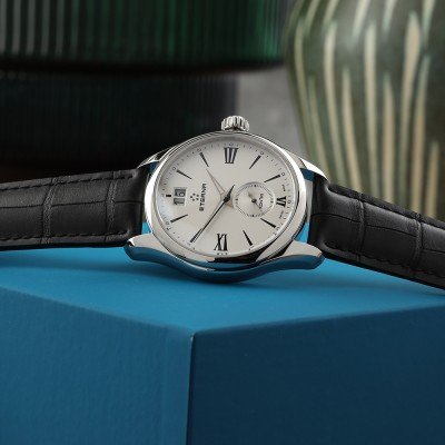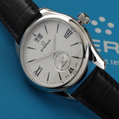 Dit Eterna horloge heeft een kast gemaakt van Staal zilver met een diameter van 36 mm en is voorzien van een leer band. In de kast bevindt zich een Ronda kwaliteitsuurwerk en is afgewerkt met Saffierglas.