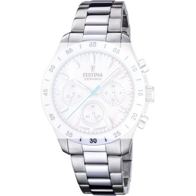 Dit Festina horlogebandje is gemaakt van roestvrij staal en wordt aan het horloge bevestigd door middel van bandpennen. De band heeft een breedte van 19 mm en wordt gesloten door middel van een vouwsluiting met drukknoppen. De band heeft geen rechte aanzet wat betekent dat deze band alleen geschikt is voor de horloges die hieronder worden vermeld.