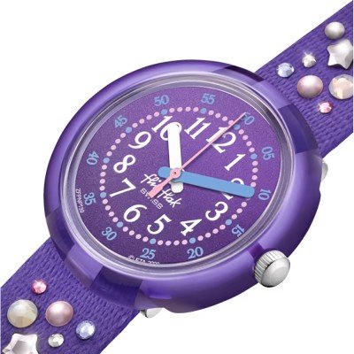 Dit Flik Flak horloge heeft een kast gemaakt van Plastic/kunsthars met een diameter van 30 mm en is voorzien van een textiel band. In de kast bevindt zich een ETA kwaliteitsuurwerk en is afgewerkt met Acrylglas.