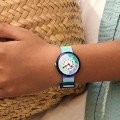 Dit Flik Flak horloge heeft een kast gemaakt van Bio-plastic met een diameter van 29.5 mm en is voorzien van een textiel band. In de kast bevindt zich een ETA kwaliteitsuurwerk en is afgewerkt met Acrylglas.