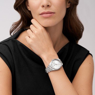 Dit Fossil horloge heeft een kast gemaakt van Staal zilver met een diameter van 38 mm en is voorzien van een Staal zilver band. In de kast bevindt zich een Miyota kwaliteitsuurwerk en is afgewerkt met Mineraalglas.