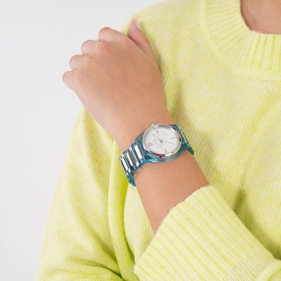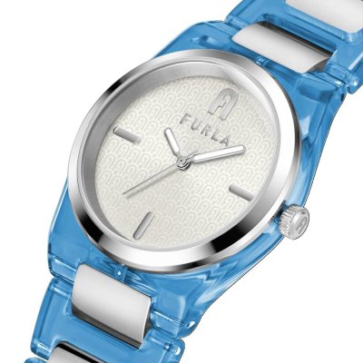 Dit Furla horloge heeft een kast gemaakt van Roestvrij staal en kunststof met een diameter van 34 mm en is voorzien van een Roestvrij staal en kunststof band. In de kast bevindt zich een Miyota kwaliteitsuurwerk en is afgewerkt met Mineraalglas.