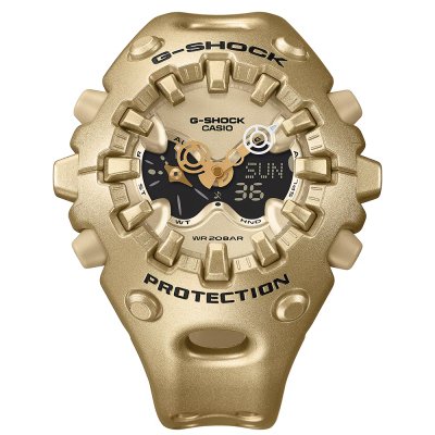 Soms denkt u misschien dat er niets meer te verbeteren valt aan horloges in de 21e eeuw, maar dan heeft u buiten G-Shock gerekend. Na veertig jaar van constante innovatie is het merk er opnieuw in geslaagd om de horlogewereld te verrassen met een volledig uniek en origineel ontwerp. Met een compleet nieuwe benadering van de constructie heeft de GA-V01 niet alleen een spectaculair uiterlijk, maar is het ook super schokbestendig en verbergt opmerkelijke technische innovaties: De kaststructuur, die het uurwerk beschermt, maakt gebruik van een geïntegreerde bezel- en armbandconstructie die het glas gedeeltelijk overlapt en zo ook als bumper fungeert om schokken op te vangen. Casio heeft ook een nieuwe magnetische wijzerconstructie ontwikkeld, waarbij de wijzers, die normaal gesproken kwetsbaar zijn voor schokken, niet aan de as zijn bevestigd, maar op hun plaats worden gehouden door magnetische kracht. Hierdoor kunnen ze schokken effectief absorberen en afvoeren. Deze nieuwe technologie maakt het ook mogelijk om grotere, uniek gevormde wijzers te maken omdat de as hun gewicht niet hoeft te dragen. Na een schok of trilling kunnen de wijzers tijdelijk uit positie verschuiven, maar binnen een paar minuten keren ze op bijna magische wijze terug naar hun oorspronkelijke positie. De analoog-digitale wijzerplaat heeft een gelaagde constructie met een metalen wijzerplaat met rastergedeeltes, die een decoratieve blik in het interieur werpen, en een LCD-display. Dit horloge is niet voor degenen die risico's mijden. Het is opvallend, groot en zal mensen zeker aan het praten krijgen! En, u bent verzekerd van een sterk en krachtig uurwerk dat blijft werken, ongeacht schokken en stoten!