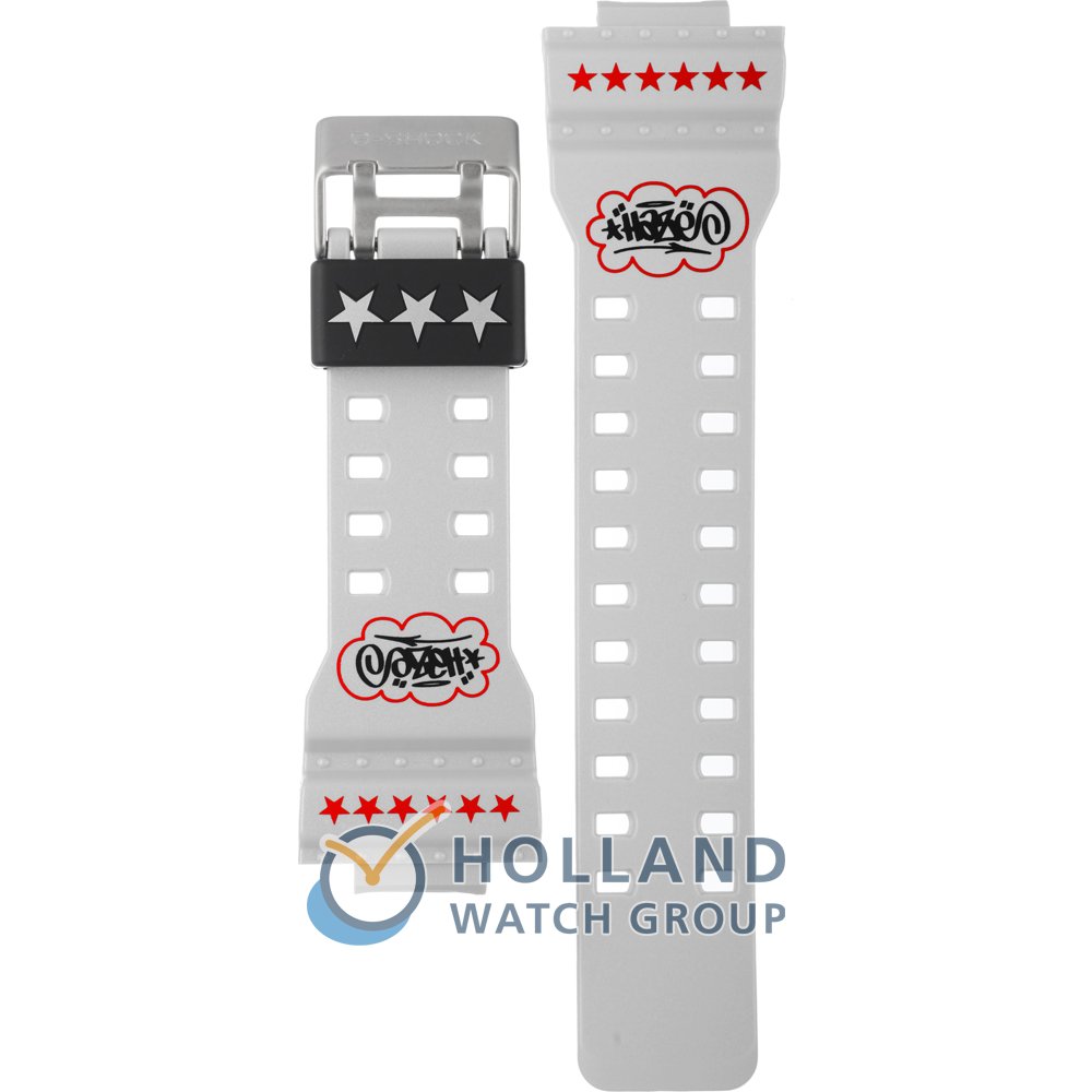 Dit G-Shock horlogebandje is gemaakt van kunststof en wordt aan het horloge bevestigd door middel van bandpennen. De band heeft een breedte van 29 mm en wordt gesloten door middel van een gesp. De band heeft geen rechte aanzet wat betekent dat deze band alleen geschikt is voor de horloges die hieronder worden vermeld.