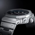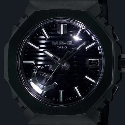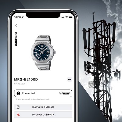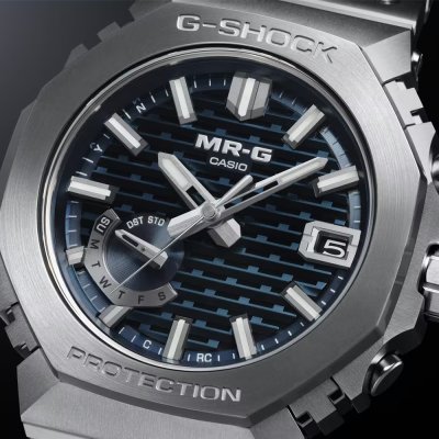 De wijzerplaat van de MRG-B2100 lijkt op het eerste gezicht een simpele donker getinte structuur, maar in feite is het een 3D-textuur die gebaseerd is op een Japanse houtbewerkingsmethode die 'kigumi' heet. Bij deze techniek worden houten onderdelen in elkaar geschoven zonder gebruik te maken van metalen bevestigingen; Een schijnbaar eenvoudige constructie met ingenieuze verbindingen om iets heel bijzonders te creëren. Hetzelfde geldt voor de MRG-B2100: naast de prachtig bewerkte wijzerplaat is het horloge een studie in vakmanschap en het combineren van innovatieve materialen. De kast en (27 individuele!) bezelcomponenten zijn gemaakt van de superharde titaniumlegering Ti64, die is geassembleerd in Casio's Premium Productielijn in Yamagata. De bovenkant van de bezel is gemaakt van COBARION, een legering die vier keer harder is dan puur titanium, en de band is gemaakt van weer een andere speciale titaniumlegering, DAT55G, die zowel extreem hard als zeer bewerkbaar is. Met een kastmaat van 44,4 × 49,5 × 13,6 mm is het een G-Shock van gemiddelde grootte, maar toch perfect draagbaar, vooral dankzij de lichtgewicht materialen, terwijl de multi-guard constructie van kast en bezel ervoor zorgt dat het horloge extra bestand is tegen schokken. Alle verschillende onderdelen van het horloge hebben een diamantachtige koolstofcoating (DLC) voor een nog betere krasbestendigheid. Het horloge wordt bestuurd door Casio's module 5718, die naast Multiband 6 radiogestuurde tijdinstelling ook smartphone koppeling via Bluetooth biedt. Andere functies zijn een automatische kalender tot 2099, waarschuwing als de batterij bijna leeg is en Super Illuminator LED-verlichting. Andere app-functies zijn automatisch overschakelen naar zomertijd (DST), automatische en one-touch tijdcorrectie, telefoonzoeker, hand-uitlijncorrectie en tijd & plaats-logboek.