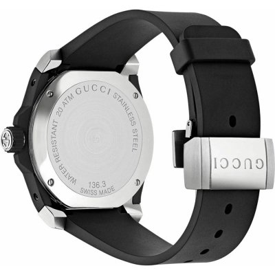 Dit Gucci horloge heeft een kast gemaakt van Staal zilver met een diameter van 40 mm en is voorzien van een Rubber band. In de kast bevindt zich een ETA kwaliteitsuurwerk en is afgewerkt met Saffierglas.