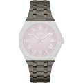 Dit Guess horlogebandje is gemaakt van roestvrij staal en wordt aan het horloge bevestigd door middel van bandpennen. De band heeft een breedte van 24 mm en wordt gesloten door middel van een vouwsluiting met drukknoppen. De band heeft geen rechte aanzet wat betekent dat deze band alleen geschikt is voor de horloges die hieronder worden vermeld.