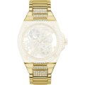 Dit Guess horlogebandje is gemaakt van metaal en wordt aan het horloge bevestigd door middel van bandpennen. De band heeft een breedte van 27 mm en wordt gesloten door middel van een vouwsluiting met drukknoppen. De band heeft geen rechte aanzet wat betekent dat deze band alleen geschikt is voor de horloges die hieronder worden vermeld.