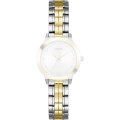 Dit Guess horlogebandje is gemaakt van metaal en wordt aan het horloge bevestigd door middel van bandpennen. De band heeft een breedte van 14 mm en wordt gesloten door middel van een vouwsluiting met drukknoppen. De band heeft geen rechte aanzet wat betekent dat deze band alleen geschikt is voor de horloges die hieronder worden vermeld.