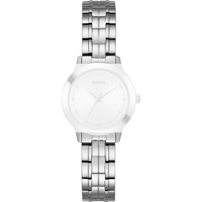 Dit Guess horlogebandje is gemaakt van metaal en wordt aan het horloge bevestigd door middel van bandpennen. De band heeft een breedte van 14 mm en wordt gesloten door middel van een vouwsluiting. De band heeft geen rechte aanzet wat betekent dat deze band alleen geschikt is voor de horloges die hieronder worden vermeld.