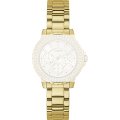 Dit Guess horlogebandje is gemaakt van metaal en wordt aan het horloge bevestigd door middel van bandpennen. De band heeft een breedte van 16 mm en wordt gesloten door middel van een vouwsluiting met drukknoppen. De band heeft geen rechte aanzet wat betekent dat deze band alleen geschikt is voor de horloges die hieronder worden vermeld.