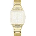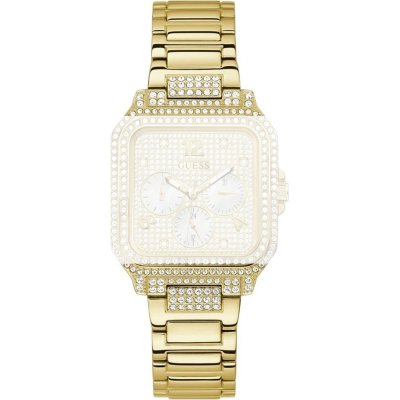 Dit Guess horlogebandje is gemaakt van roestvrij staal en wordt aan het horloge bevestigd door middel van bandpennen. De band heeft een breedte van 20 mm en wordt gesloten door middel van een vouwsluiting met drukknoppen. De band heeft geen rechte aanzet wat betekent dat deze band alleen geschikt is voor de horloges die hieronder worden vermeld.