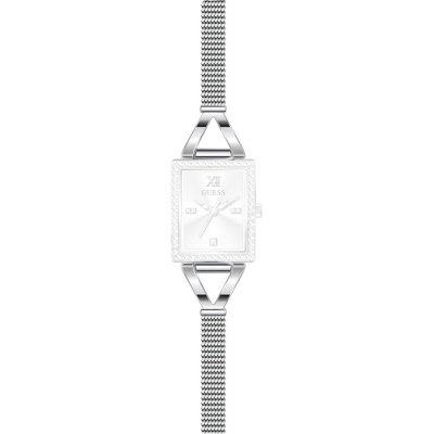 Dit Guess horlogebandje is gemaakt van roestvrij staal en wordt aan het horloge bevestigd door middel van stalen pennen. De band heeft een breedte van 6 mm en wordt gesloten door middel van een milanese sluiting. De band heeft geen rechte aanzet wat betekent dat deze band alleen geschikt is voor de horloges die hieronder worden vermeld.