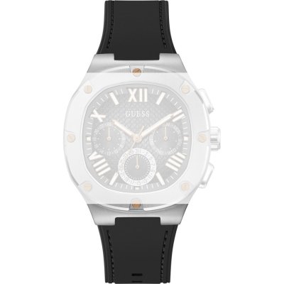 Dit Guess horlogebandje is gemaakt van siliconen en wordt aan het horloge bevestigd door middel van stalen pennen. De band heeft een breedte van 25 mm en wordt gesloten door middel van een gesp. De band heeft geen rechte aanzet wat betekent dat deze band alleen geschikt is voor de horloges die hieronder worden vermeld.