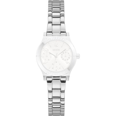 Dit Guess horlogebandje is gemaakt van metaal en wordt aan het horloge bevestigd door middel van bandpennen. De band heeft een breedte van 14 mm en wordt gesloten door middel van een vouwsluiting met veiligheidsklep. De band heeft geen rechte aanzet wat betekent dat deze band alleen geschikt is voor de horloges die hieronder worden vermeld.