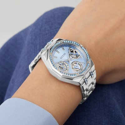 Dit Guess horloge heeft een kast gemaakt van Staal zilver met een diameter van 36 mm en is voorzien van een Staal zilver band. In de kast bevindt zich een Seiko Instruments Inc. kwaliteitsuurwerk en is afgewerkt met Mineraalglas.