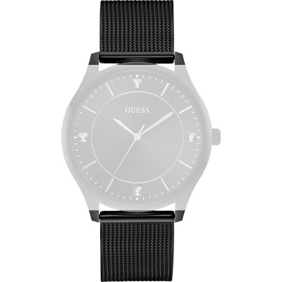 Dit Guess horlogebandje is gemaakt van metaal en wordt aan het horloge bevestigd door middel van bandpennen. De band heeft een breedte van 22 mm en wordt gesloten door middel van een milanese sluiting. De band heeft geen rechte aanzet wat betekent dat deze band alleen geschikt is voor de horloges die hieronder worden vermeld.