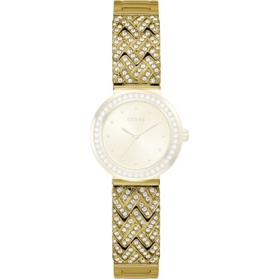 Dit Guess horlogebandje is gemaakt van metaal en wordt aan het horloge bevestigd door middel van stalen pennen. De band heeft een breedte van 14 mm en wordt gesloten door middel van een sieraadsluiting. De band heeft geen rechte aanzet wat betekent dat deze band alleen geschikt is voor de horloges die hieronder worden vermeld.