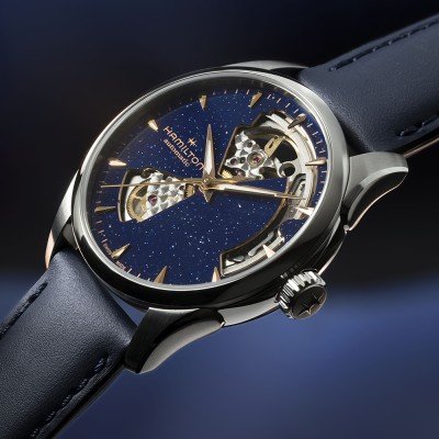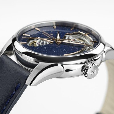De nieuwste toevoeging aan de Jazzmaster Open heart serie voor dames is deze prachtige middernachtblauwe wijzerplaat, waarvan de structuur is geïnspireerd op de edelsteen aventurijn. Het diepe blauw en het glinsterende, sprankelende effect creëren een betoverende verschijning en trekken het oog naar het H-10 automatische uurwerk - met 80 uur gangreserve - dat door de opening in de wijzerplaat te zien is. Elegantie en mysterie gecombineerd met een vleugje luxe.
