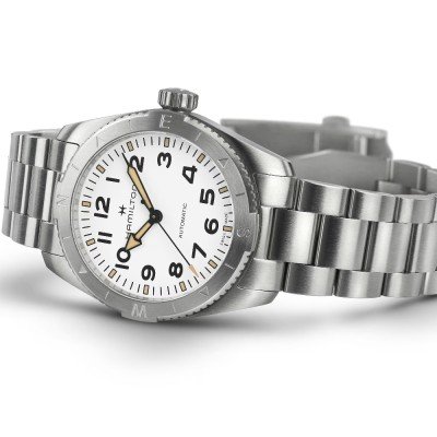 De pijlwijzers met kunstmatig gepatineerde lumen vormen het middelpunt van de aandacht op dit klassieke veldhorloge. Met zijn duidelijk afleesbare wijzerplaat en eenvoudige kompasring is de Khaki Field Expedition een outdoorhorloge in militaire stijl zonder franje, dat met 37 mm geschikt is voor zowel mannen als vrouwen. Het horloge is verkrijgbaar in verschillende kleuren en met een roestvrijstalen horlogeband, leren horlogeband en NATO-band. We raden aan de kleurvariant van uw keuze aan te schaffen en dan een extra band te bestellen voor een andere stijl of functie.