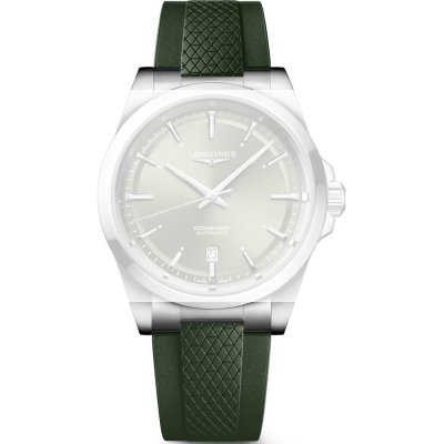 Dit Longines horlogebandje is gemaakt van rubber en wordt aan het horloge bevestigd door middel van bandpennen. De band heeft een breedte van 21 mm. De band heeft geen rechte aanzet wat betekent dat deze band alleen geschikt is voor de horloges die hieronder worden vermeld.