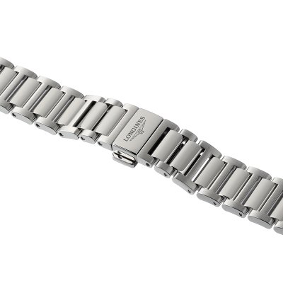Dit Longines horlogebandje is gemaakt van roestvrij staal en wordt aan het horloge bevestigd door middel van bandpennen. De band heeft een breedte van 17 mm en wordt gesloten door middel van een vlindersluiting met drukknoppen. De band heeft geen rechte aanzet wat betekent dat deze band alleen geschikt is voor de horloges die hieronder worden vermeld.
