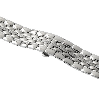 Dit Maurice Lacroix horlogebandje is gemaakt van roestvrij staal en wordt aan het horloge bevestigd door middel van stalen pennen. De band heeft een breedte van 18 mm en wordt gesloten door middel van een vlindersluiting met drukknoppen. De band heeft geen rechte aanzet wat betekent dat deze band alleen geschikt is voor de horloges die hieronder worden vermeld.
