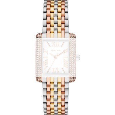 Dit Michael Kors horlogebandje is gemaakt van roestvrij staal en wordt aan het horloge bevestigd door middel van bandpennen. De band heeft een breedte van 18 mm en wordt gesloten door middel van een vouwsluiting met drukknoppen. De band heeft geen rechte aanzet wat betekent dat deze band alleen geschikt is voor de horloges die hieronder worden vermeld.