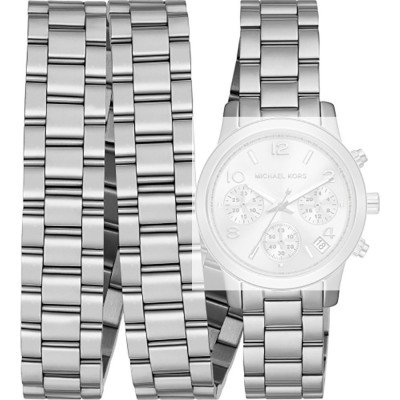 Dit Michael Kors horlogebandje is gemaakt van roestvrij staal en wordt aan het horloge bevestigd door middel van bandpennen. De band heeft een breedte van 16 mm en wordt gesloten door middel van een sieraadsluiting. De band heeft geen rechte aanzet wat betekent dat deze band alleen geschikt is voor de horloges die hieronder worden vermeld.