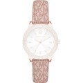 Dit Michael Kors horlogebandje is gemaakt van leer en wordt aan het horloge bevestigd door middel van bandpennen. De band heeft een breedte van 16 mm en wordt gesloten door middel van een gesp. De band heeft geen rechte aanzet wat betekent dat deze band alleen geschikt is voor de horloges die hieronder worden vermeld.