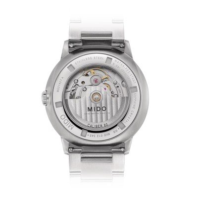 De Mido Commander horlogeserie bestaat al sinds 1959. In de loop der jaren zijn de horloges vernieuwd en natuurlijk voorzien van de nieuwste technische innovaties. Het Commander Gradient horloge heeft een speciale wijzerplaat, gemaakt van transparant acryl, met een rokerig kleurverloop dat naar de randen toe steeds ondoorzichtiger wordt. Dit betekent dat het binnenwerk van het horloge zichtbaar is door de wijzerplaat - hoewel gehuld in een mysterieus kleureffect - terwijl de datum op 3 uur en de stokvormige wijzers perfect opvallen. Het horloge wordt aangedreven door een kaliber 80 automatisch uurwerk met een verbluffende gangreserve van 80 uur! Dit uurwerk, met prachtig 'geguillocheerde' rotor, is niet alleen zichtbaar vanaf de voorkant, maar ook vanaf de achterkant van het horloge.