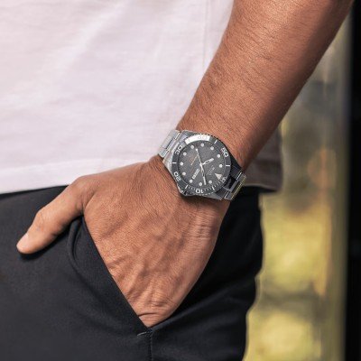 De Mido Ocean Star 200C is een klassiek duikhorloge dat functionaliteit en stijl combineert. De wijzerplaat is gegraveerd met een bijpassend gestileerd golfpatroon en bevat een dag-datum weergave op 3 uur. Typische kenmerken van een duikhorloge zijn de schroefkroon met kroonbeschermer, individueel aangebrachte indexen met witte Super-LuminovaÂŽ coating en natuurlijk 20 ATM waterdichtheid. De uni-directionele duikring van het horloge verdient een speciale vermelding: die is ingelegd met satijnzacht ganzend keramiek in dezelfde kleur als de wijzerplaat. Het automatische Caliber 80 uurwerk, met een gangreserve van maximaal 80 uur, zorgt voor een uitstekende betrouwbaarheid, in een horloge dat ideaal is voor horlogeliefhebbers die op een dagelijkse basis op zoek zijn naar prestaties en een top-uiterlijk.
