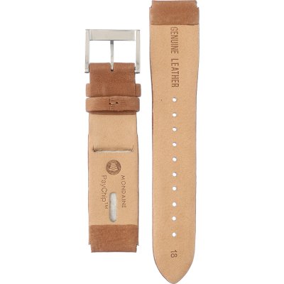 Dit Mondaine horlogebandje is gemaakt van leer en wordt aan het horloge bevestigd door middel van bandpennen. De band heeft een breedte van 18 mm en wordt gesloten door middel van een gesp. De band heeft een rechte aanzet wat betekent dat deze band geschikt is voor alle Mondaine horloges met een rechte aanzet.