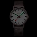 Dit Mondaine horloge heeft een kast gemaakt van Staal zilver met een diameter van 40 mm en is voorzien van een Staal zilver band. In de kast bevindt zich een Ronda kwaliteitsuurwerk en is afgewerkt met Gehard mineraalglasglas.
