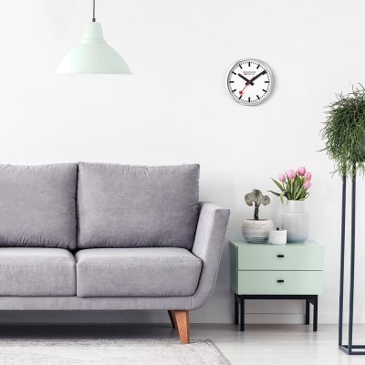 Deze Stop2go wandklok heeft dezelfde functionaliteit als een originele Zwitserse stationsklok: de rode secondewijzer stopt 2 seconden wanneer hij 12 uur bereikt, voordat hij naar de volgende minuut springt.