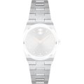 Dit Movado horlogebandje is gemaakt van roestvrij staal en wordt aan het horloge bevestigd door middel van schroeven. De band heeft een breedte van 16 mm en wordt gesloten door middel van een onzichtbare vlindersluiting. De band heeft geen rechte aanzet wat betekent dat deze band alleen geschikt is voor de horloges die hieronder worden vermeld.