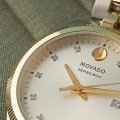 Dit prachtige klassieke bicolor Movado dameshorloge heeft 10 echte diamanten indexen en een glanzende geribbelde lunette.