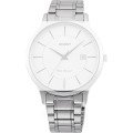 Dit Orient horlogebandje is gemaakt van roestvrij staal en wordt aan het horloge bevestigd door middel van bandpennen. De band heeft een breedte van 18 mm en wordt gesloten door middel van een vouwsluiting met drukknoppen. De band heeft geen rechte aanzet wat betekent dat deze band alleen geschikt is voor de horloges die hieronder worden vermeld.