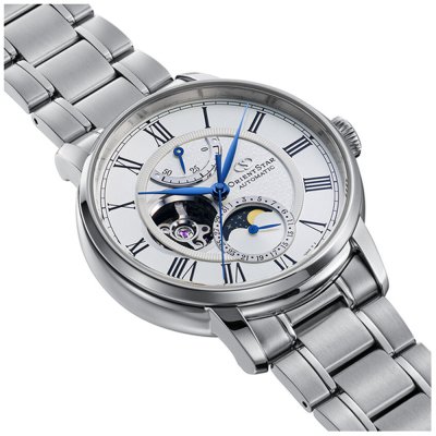 Het mechanische Classic M45 horloge is gebaseerd op de Mechanical Moon Phase uit 2017. De belangrijkste update van dit horloge is het ontwerp van de maanfase. De achtergrond van de maan is veranderd in een levendige, diepblauw gekleurde nachthemel en de sterren lijken scherper door een verbeterde helderheid. Bovendien heeft het gebogen saffierglas nu aan beide zijden een ontspiegelende (SAR) coating, die ongeveer negenennegentig procent van de reflecties blokkeert. Hierdoor lijkt het alsof het horloge helemaal geen glas heeft! Ook is het Orient Star-logo - in het midden van de wijzerplaat - alleen zichtbaar afhankelijk van de lichthoek. Het in-huis gemaakte F7M42 automatische uurwerk met 50 uur gangreserve en prachtig geguillocheerde rotor is zichtbaar door de achterkant van de kast, waardoor deze M45 een compleet en prachtig gedetailleerd maanfasehorloge is.