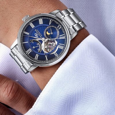 Het mechanische Classic M45 horloge is gebaseerd op de Mechanical Moon Phase uit 2017. De belangrijkste update van dit horloge is het ontwerp van de maanfase. De achtergrond van de maan is veranderd in een levendige, diepblauw gekleurde nachthemel en de sterren lijken scherper door een verbeterde helderheid. Bovendien heeft het gebogen saffierglas nu aan beide zijden een ontspiegelende (SAR) coating, die ongeveer negenennegentig procent van de reflecties blokkeert. Hierdoor lijkt het alsof het horloge helemaal geen glas heeft! Ook is het Orient Star-logo - in het midden van de wijzerplaat - alleen zichtbaar afhankelijk van de lichthoek. Het in-huis gemaakte F7M42 automatische uurwerk met 50 uur gangreserve en prachtig geguillocheerde rotor is zichtbaar door de achterkant van de kast, waardoor deze M45 een compleet en prachtig gedetailleerd maanfasehorloge is.