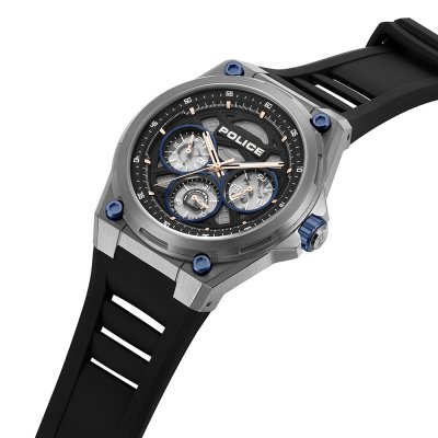 Dit Police horloge heeft een kast gemaakt van Staal zilver met een diameter van 45 mm en is voorzien van een Rubber band. In de kast bevindt zich een Seiko Instruments Inc. kwaliteitsuurwerk en is afgewerkt met Mineraalglas.