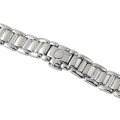 Dit Raymond Weil horlogebandje is gemaakt van roestvrij staal en wordt aan het horloge bevestigd door middel van bandpennen. De band heeft een breedte van 16 mm en wordt gesloten door middel van een vlindersluiting met drukknoppen. De band heeft geen rechte aanzet wat betekent dat deze band alleen geschikt is voor de horloges die hieronder worden vermeld.
