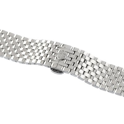 Dit Raymond Weil horlogebandje is gemaakt van roestvrij staal en wordt aan het horloge bevestigd door middel van bandpennen. De band heeft een breedte van 21 mm en wordt gesloten door middel van een vlindersluiting met drukknoppen. De band heeft geen rechte aanzet wat betekent dat deze band alleen geschikt is voor de horloges die hieronder worden vermeld.