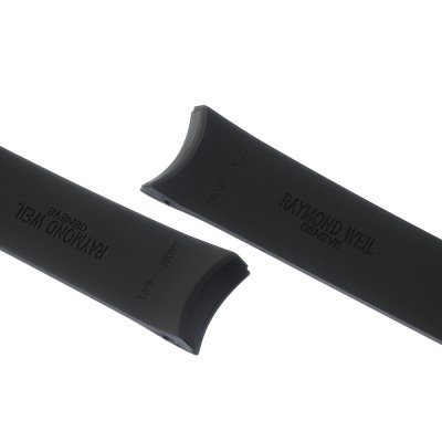 Dit Raymond Weil horlogebandje is gemaakt van rubber en wordt aan het horloge bevestigd door middel van stalen pennen. De band heeft een breedte van 20 mm. De band heeft geen rechte aanzet wat betekent dat deze band alleen geschikt is voor de horloges die hieronder worden vermeld.