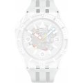 Dit Swatch horlogebandje is gemaakt van siliconen en wordt aan het horloge bevestigd door middel van stalen pennen. De band heeft een breedte van 26 mm en wordt gesloten door middel van een gesp. De band heeft geen rechte aanzet wat betekent dat deze band alleen geschikt is voor de horloges die hieronder worden vermeld.